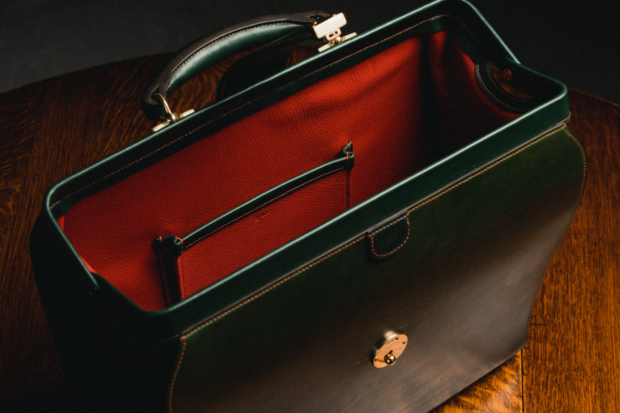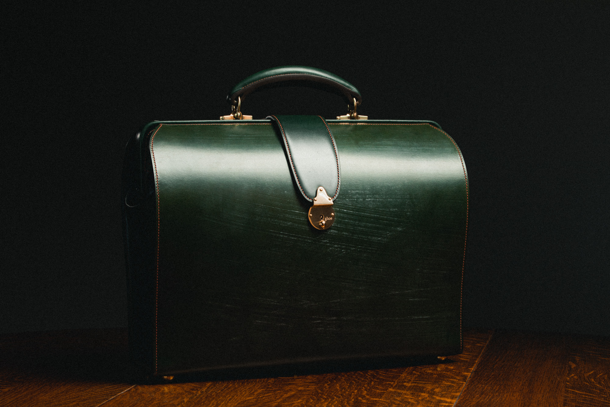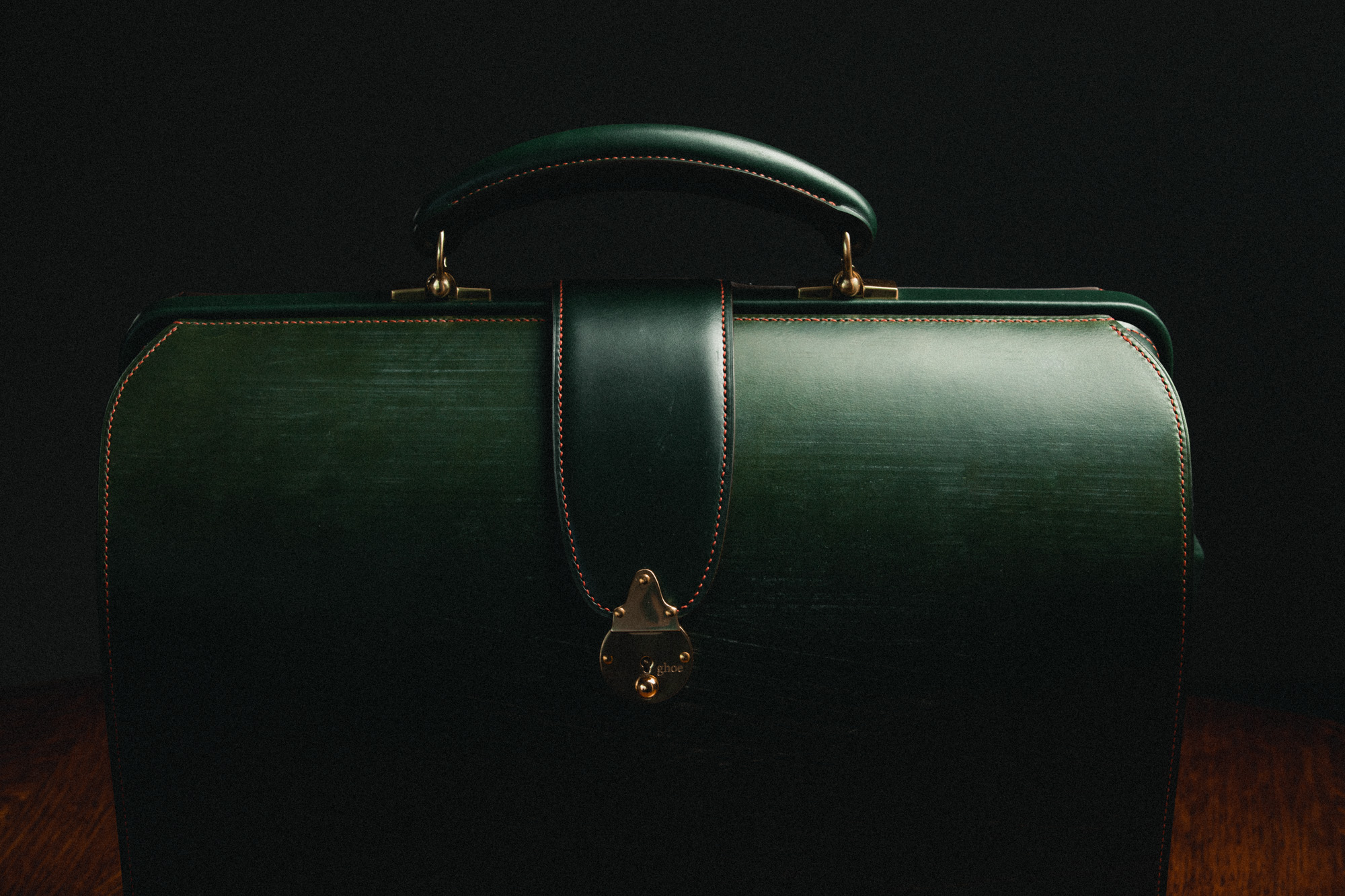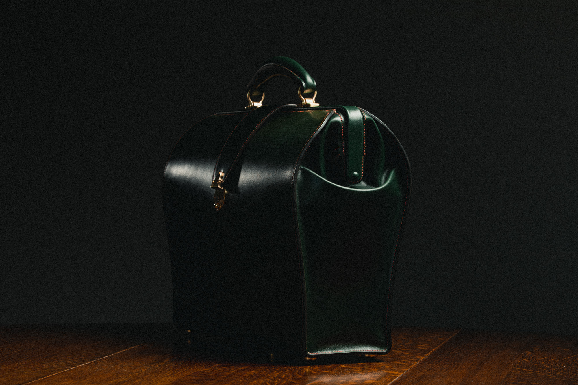 胴体両端を縫い目とコバが囲む、フォーマルな鞄です。