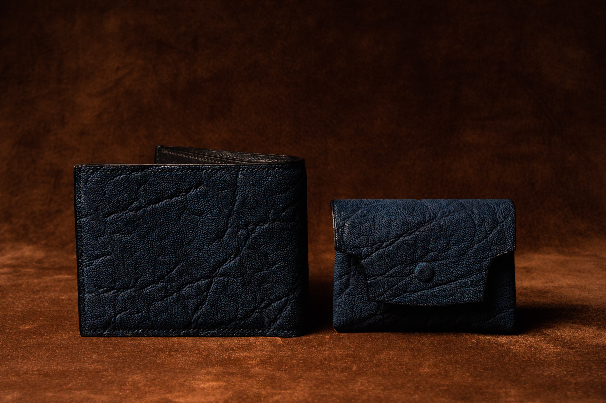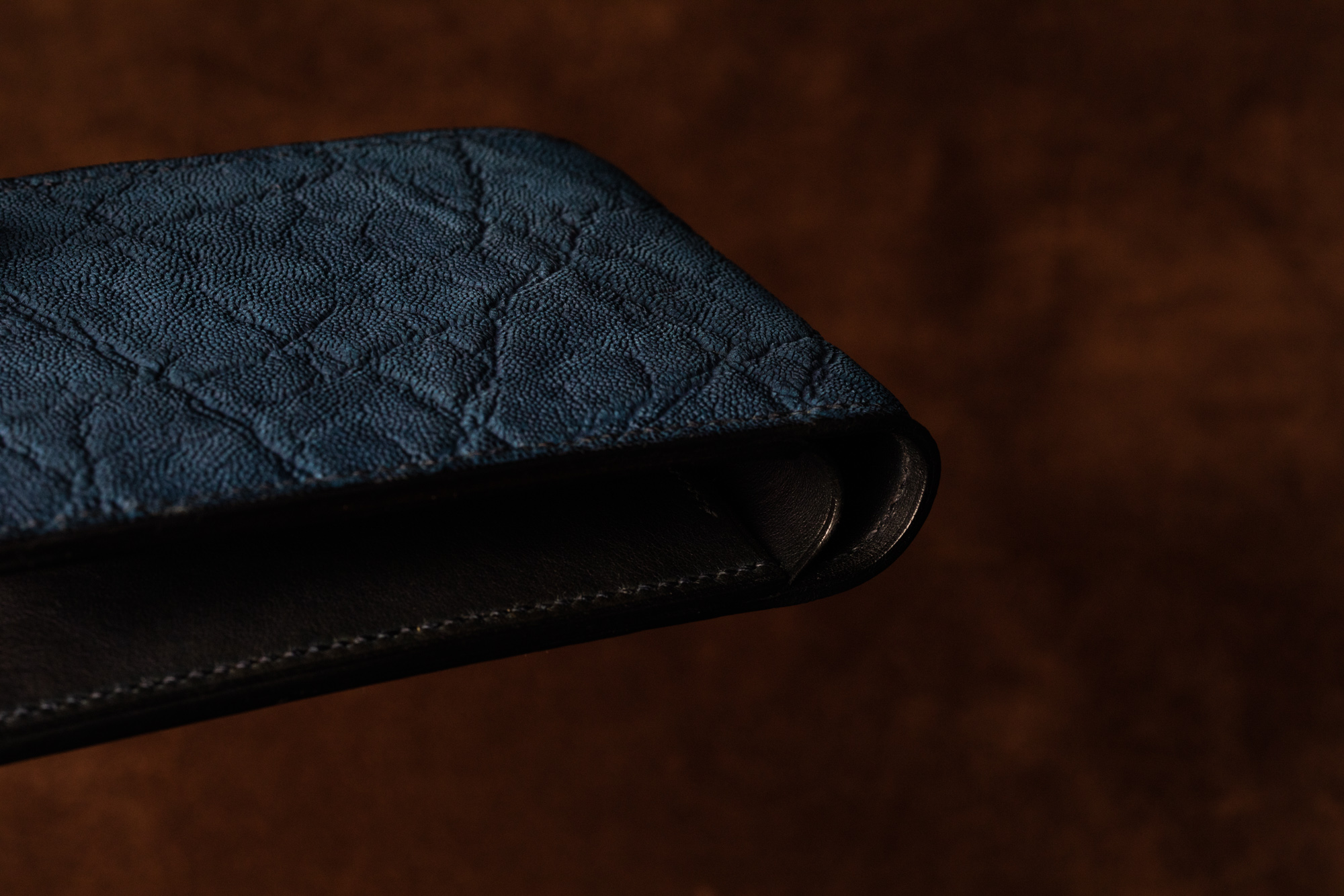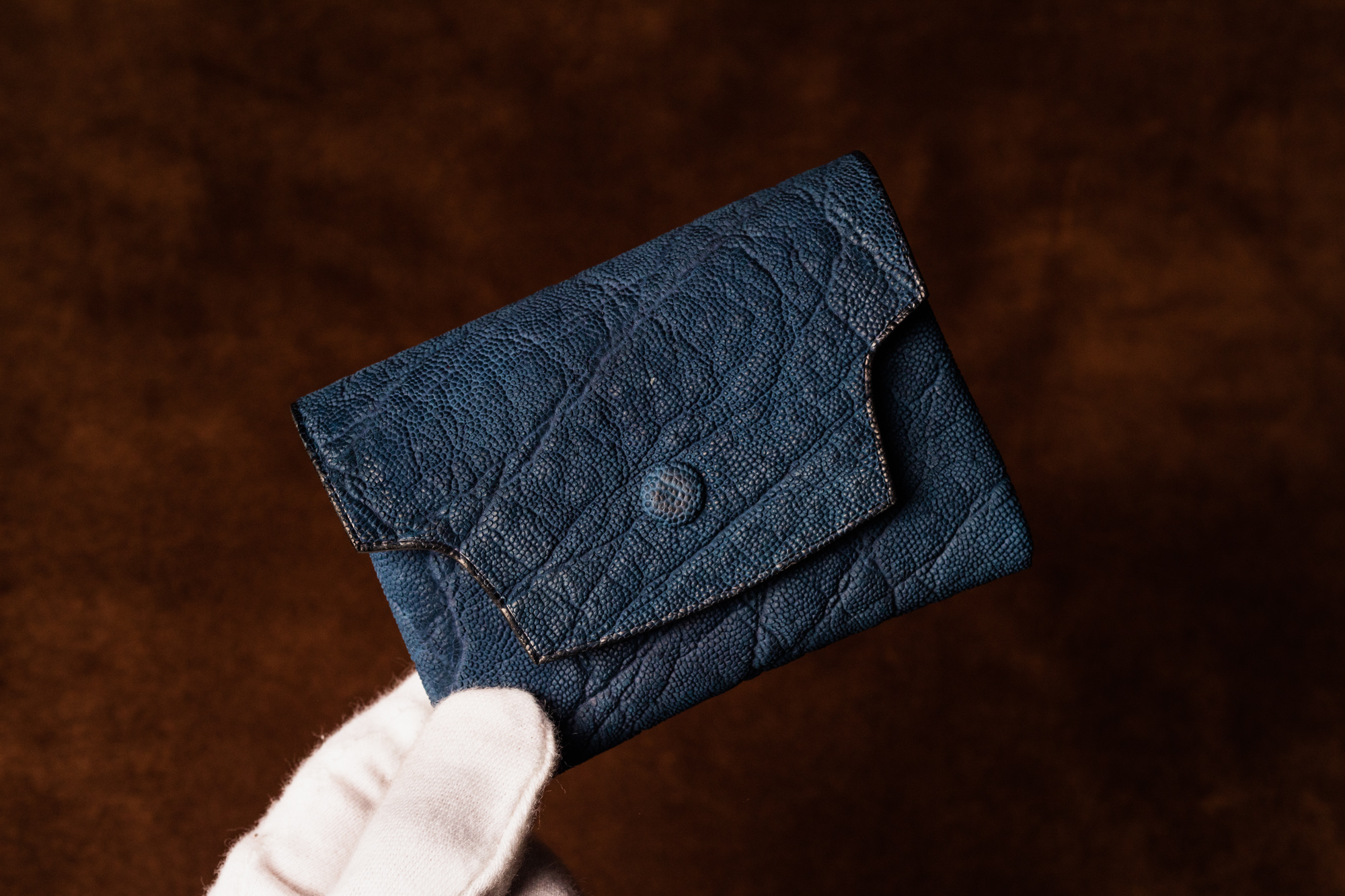 本藍染革。和紙や絹織物のような「和」を感じさせる質感です。