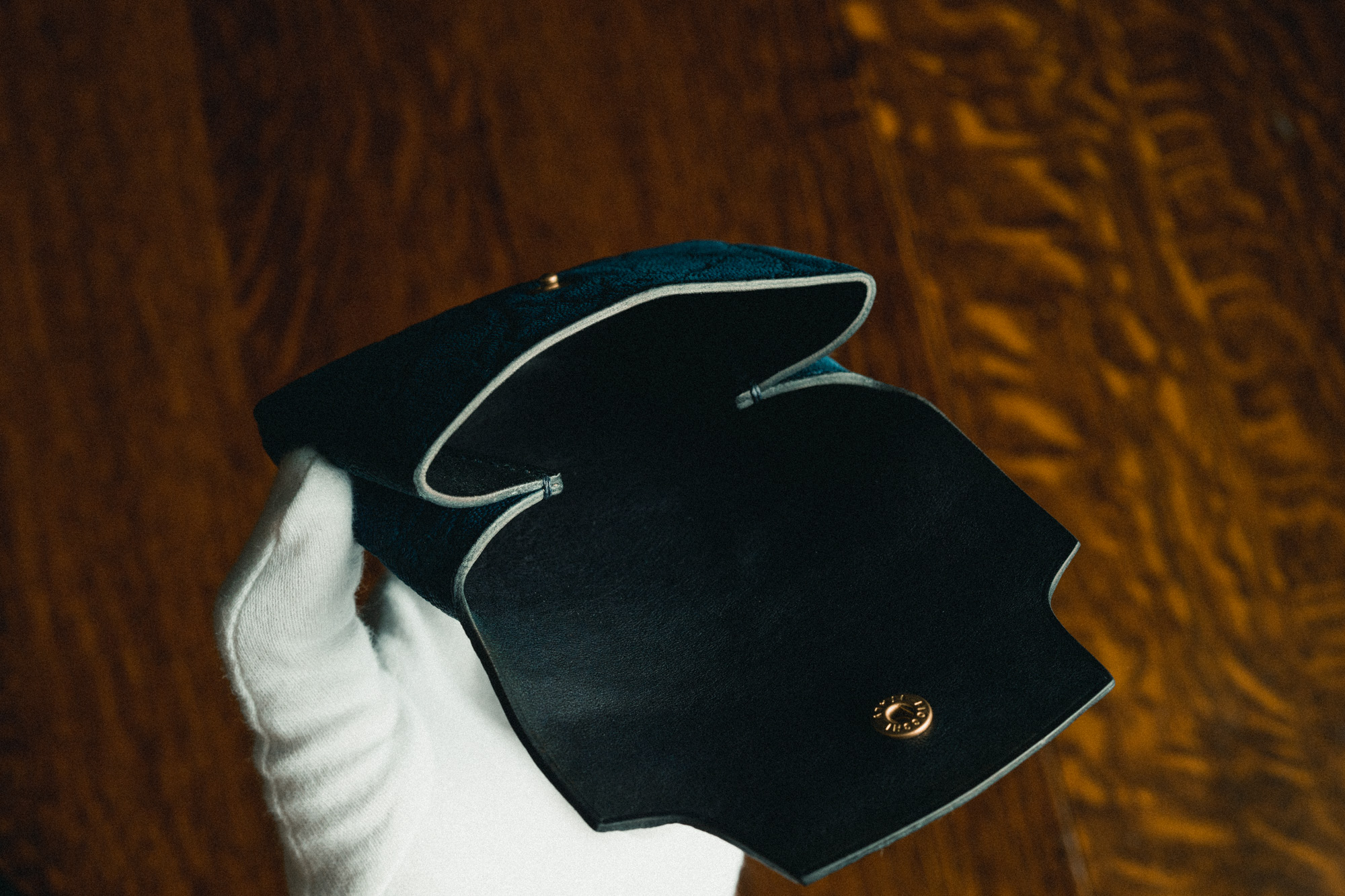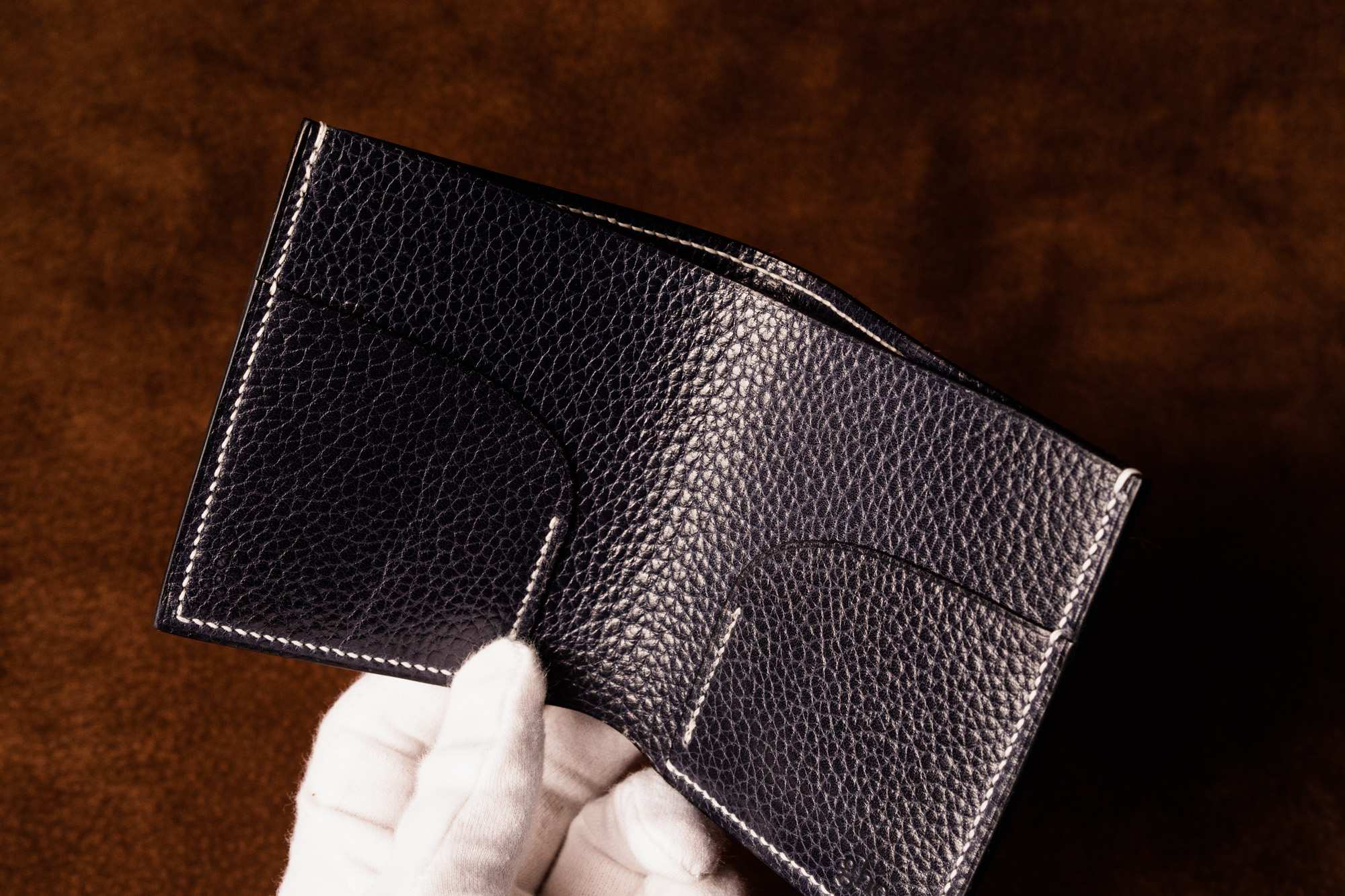 ・二折札入れとコインケースCS04、QC09 のセット。ネイビーに白糸、涼しげで爽やかな組み合わせです。