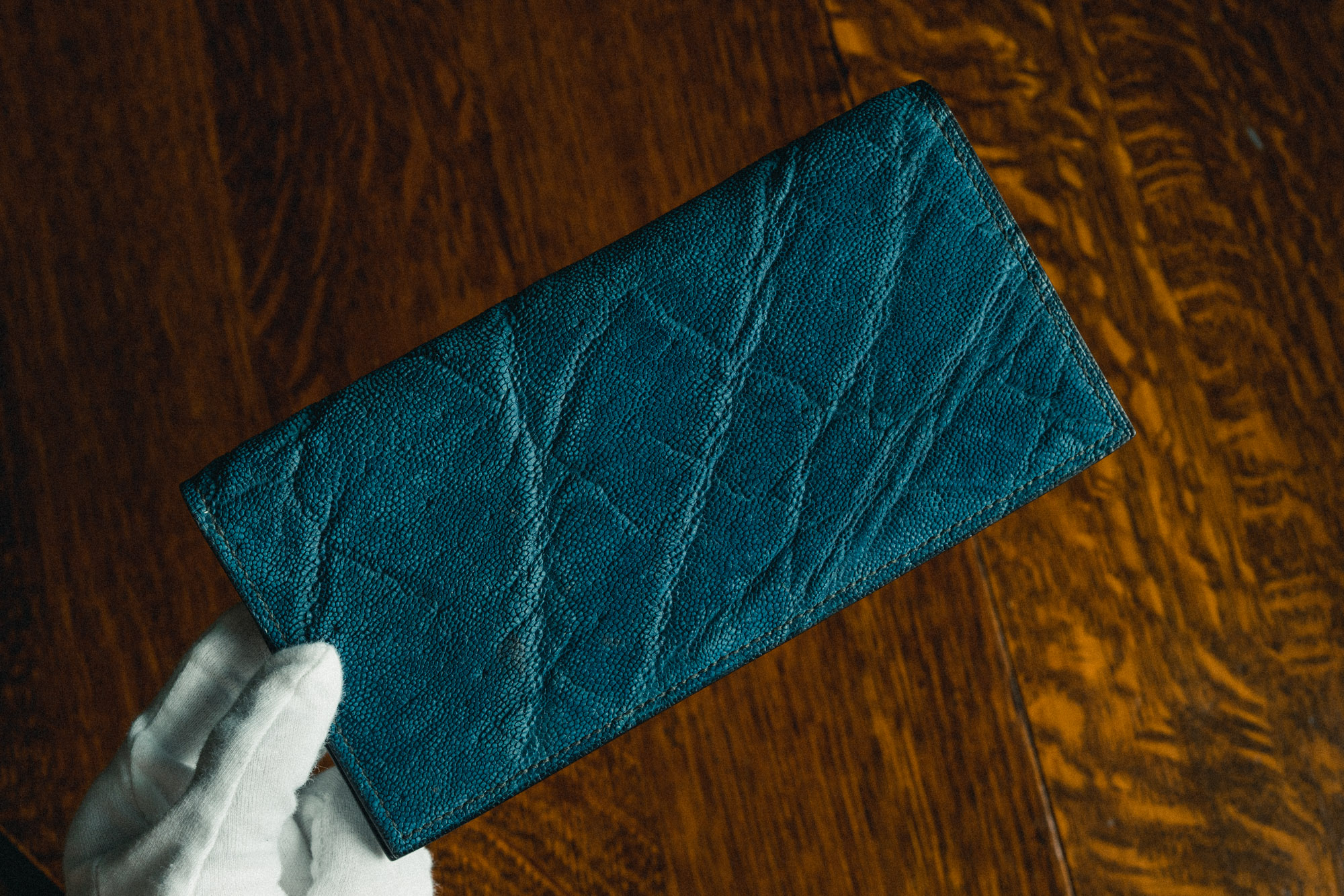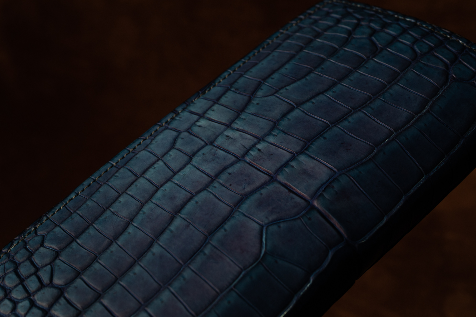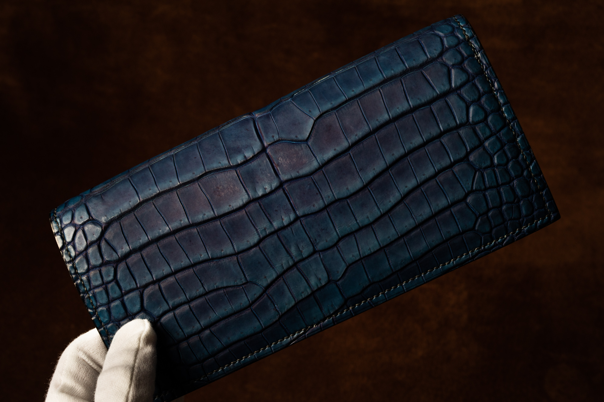 ・本藍染クロコダイルスモールクロコ(ポロサス)の長財布。ひとつひとつの班の中でグラデーションがかった、美しい染め上がりです。
