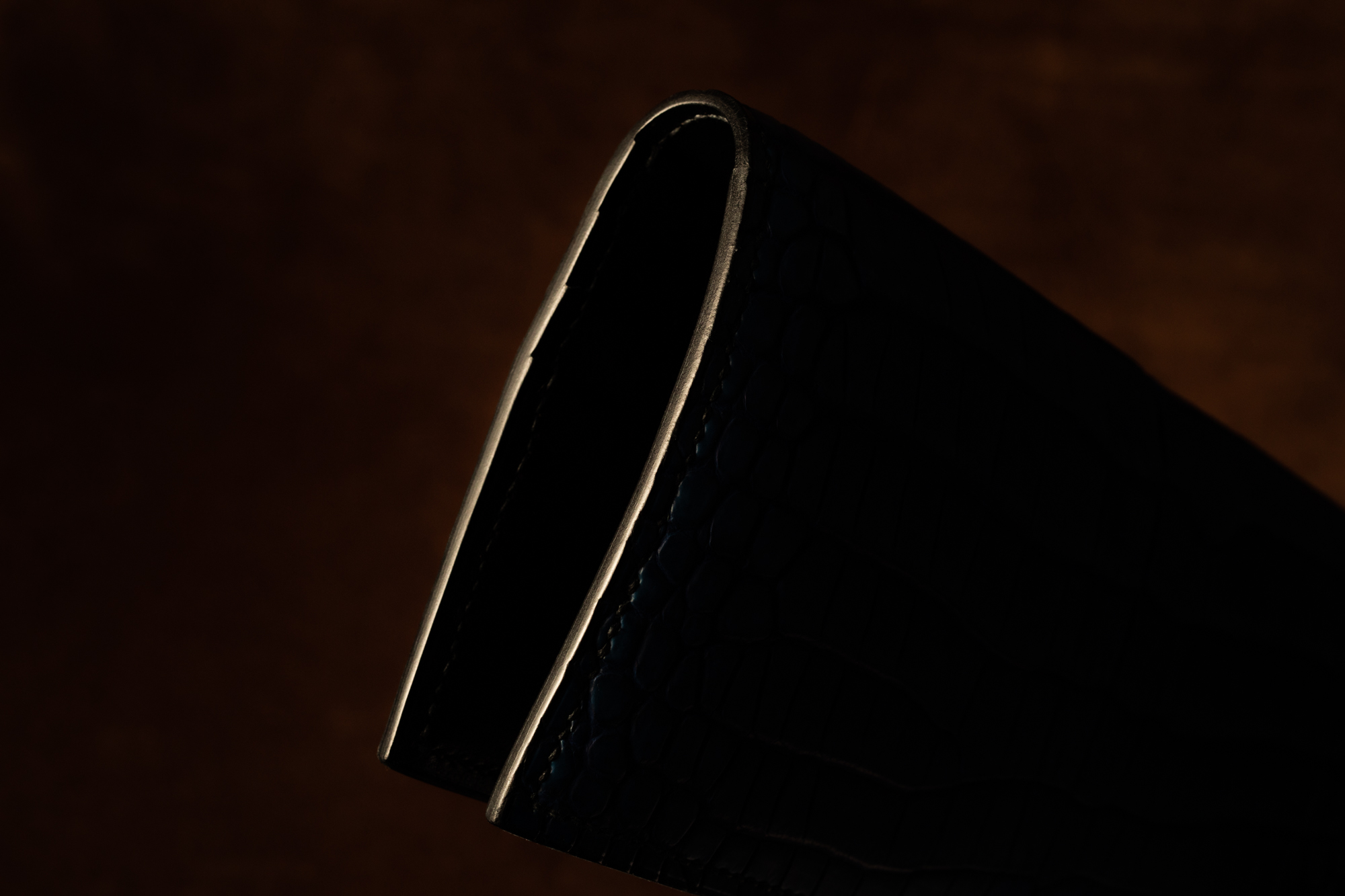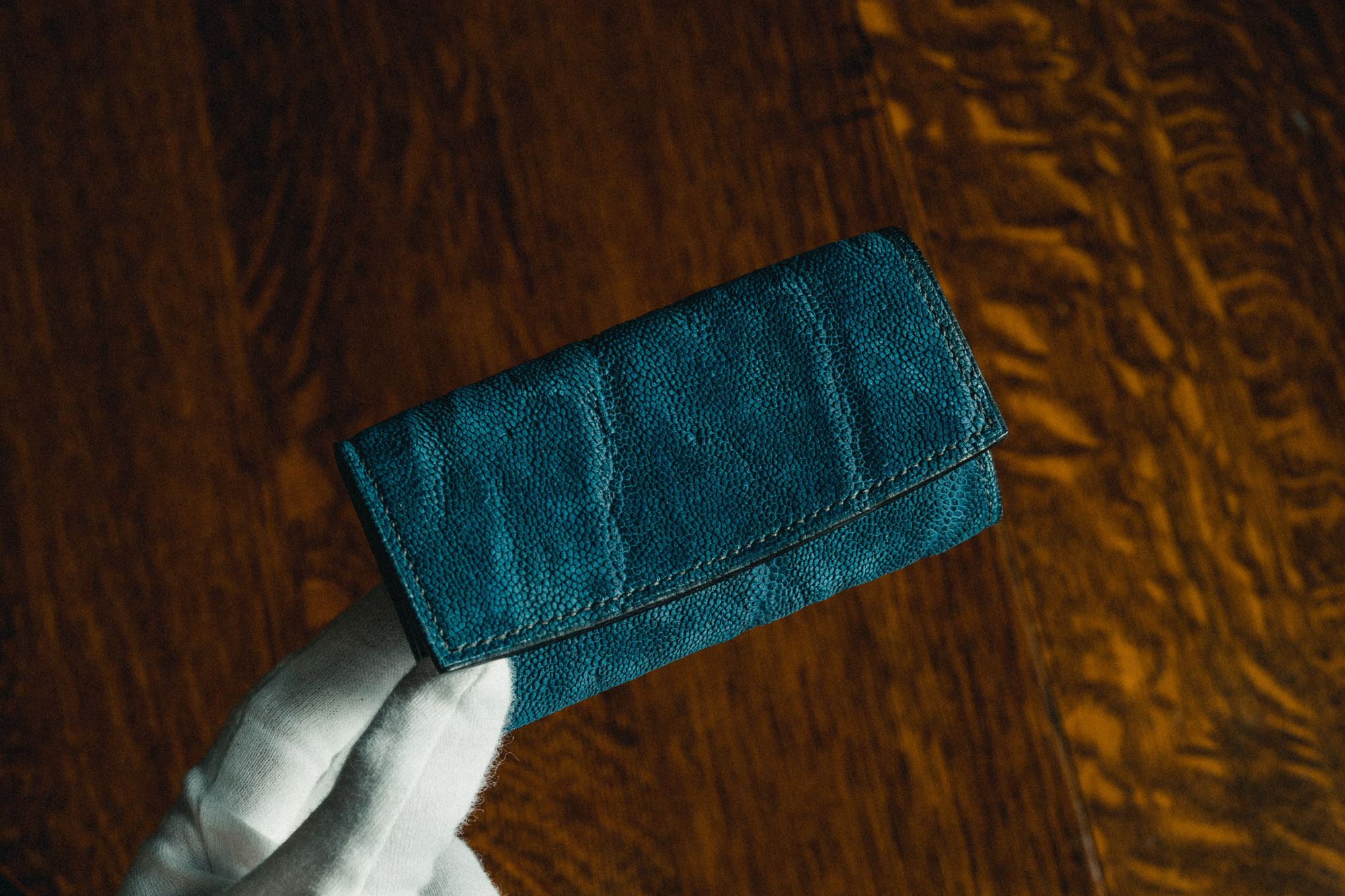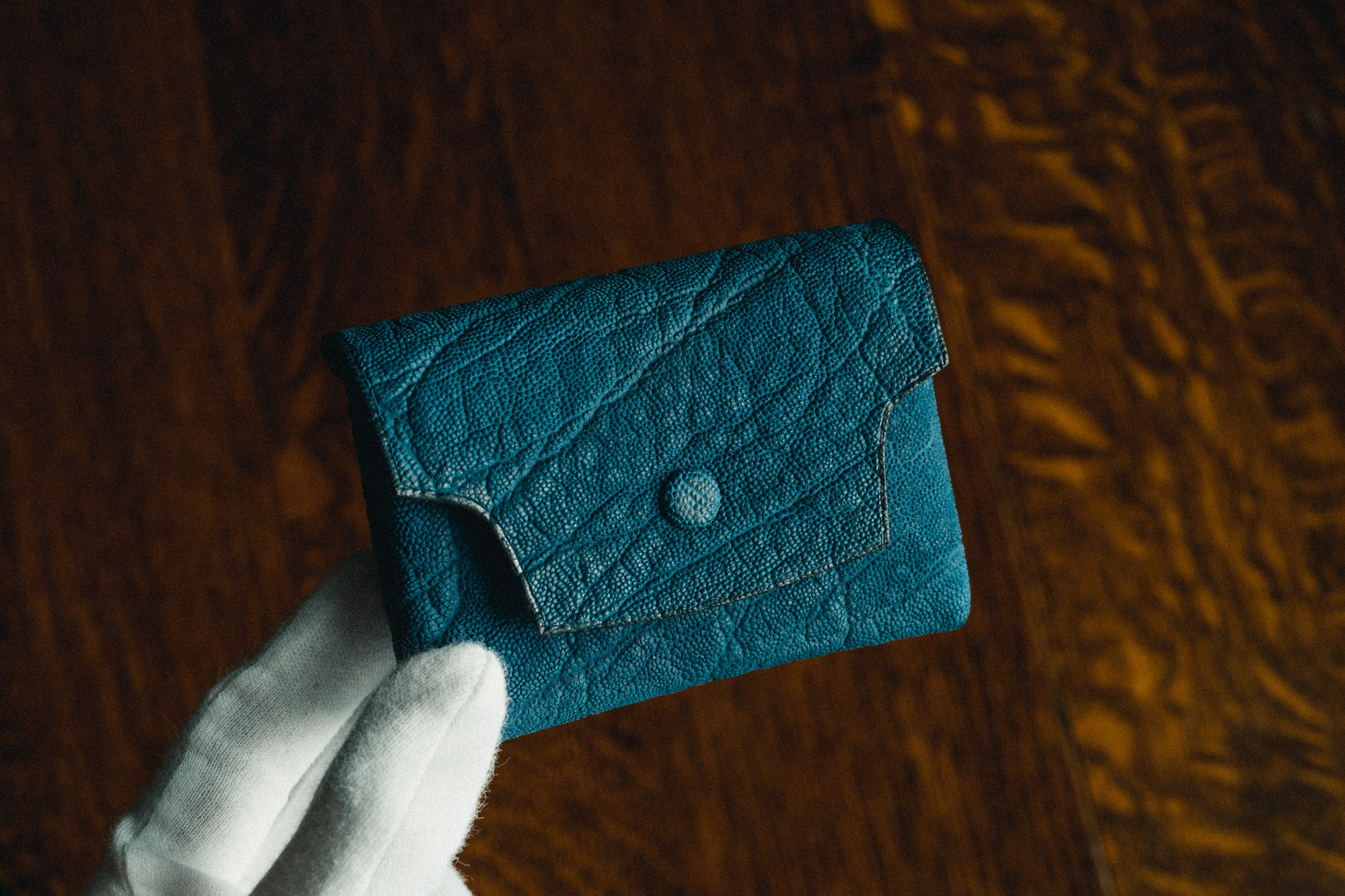・本藍染クロコダイルスモールクロコ(ポロサス)の長財布。ひとつひとつの班の中でグラデーションがかった、美しい染め上がりです。