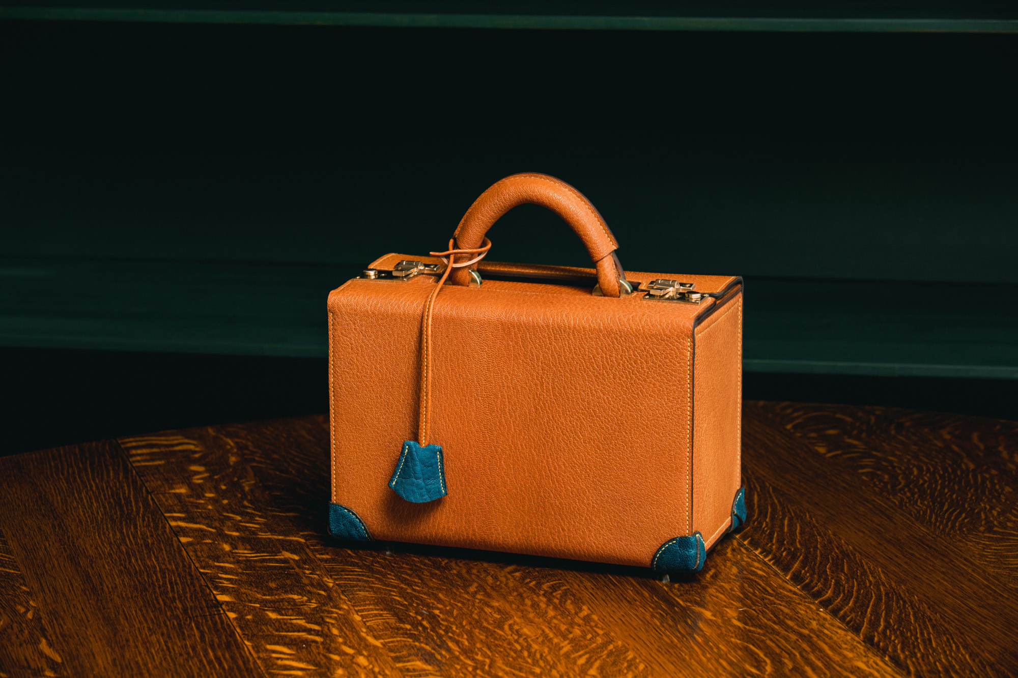 革は当工房オリジナルで染色してもらった茶利八方、コーナーパッチに本藍染エレファント、明るい色のステッチ。
